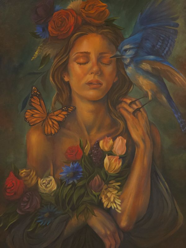 "Birds of Praise" centers around the potency of language. The doves featured in the painting serve as a symbol of the significance of speaking from a position of tranquility and understanding. Conversely, the hand encircling the neck signifies society's persistent desire to control and regulate our personal truths.