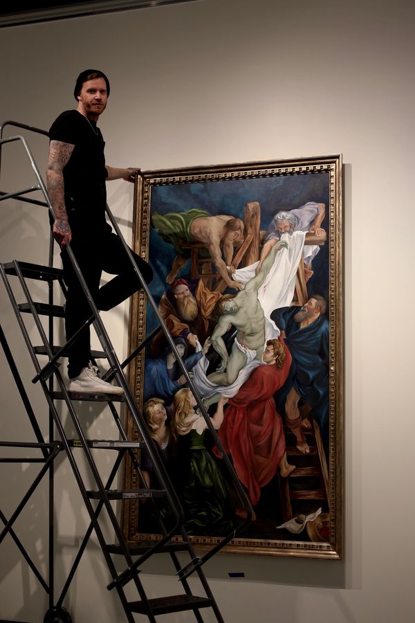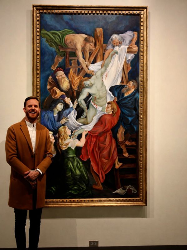 For the Spartanburg Art Museum’s Counterfeit: Forgeries for a Cause exhibition, Johni Bleu created a large-scale reinterpretation of Peter Paul Rubens’ Descent from the Cross. The 8 x 4 foot oil painting explored classical Baroque composition, dramatic lighting, and the technical challenge of recreating a historic masterwork through contemporary practice.