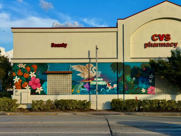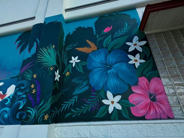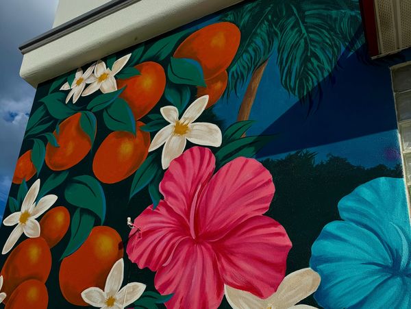 The mural builds a bridge between cultural symbolism and local identity by surrounding the central figures with oranges, hibiscus, plumeria, and tropical foliage. These elements root the painting firmly in Florida’s ecology and visual personality.