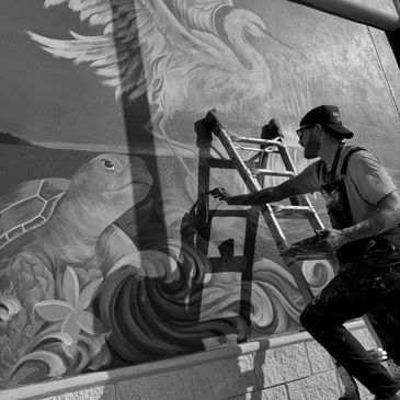 Created for Ava Laurenne’s Greenville location, this large-scale mural blends elegance and storytelling through layered symbolic detail. The project later expanded into a live fashion event, where Johni Bleu hand-painted a custom gown during a red carpet runway supporting artists affected by Hurricane Helene.